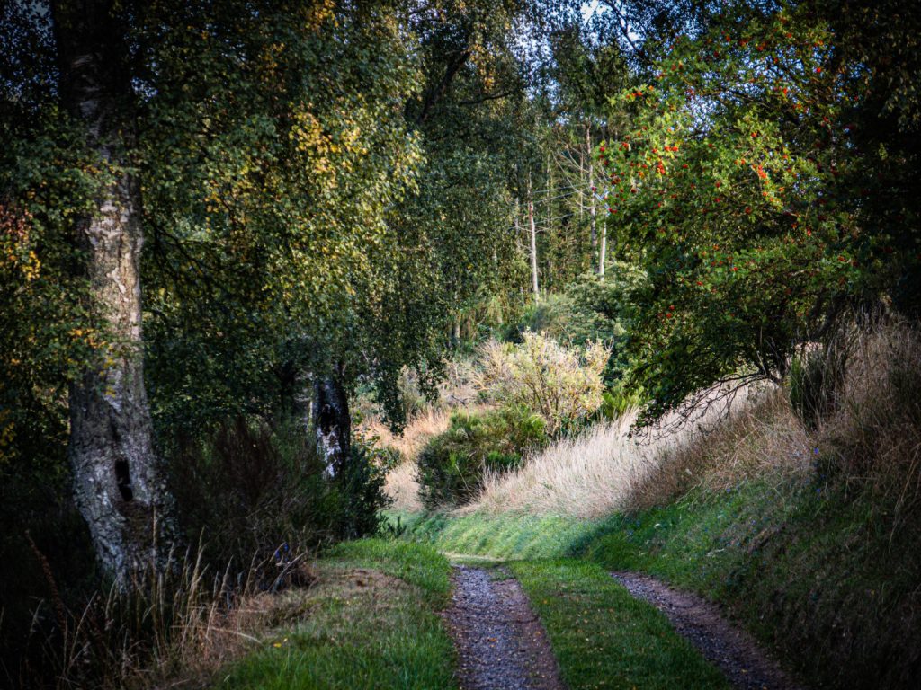 The route leaves town along Losset Road, before joining a small path that links up with the B952/B954 near the Pitcrocknie Stone. From here, it continues along a quiet road passing below the Shanzie Souterrain. Although the underground structure itself has been sealed, the mound that remains is still clearly visible from the road.